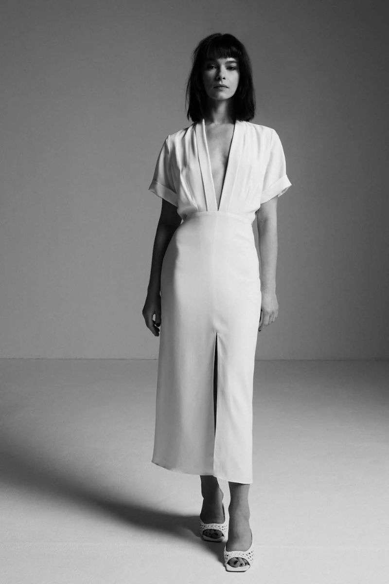 Robe midi en crêpe lourd, urbaine et élégante, pour mariage civil.
