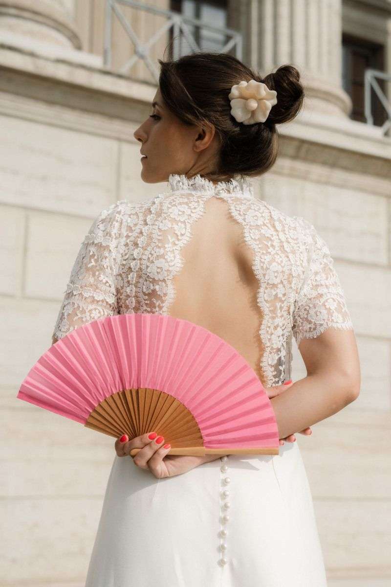 Buste en dentelle de Calais, rebrodé de guipure en bande, dos nu V inversé.
