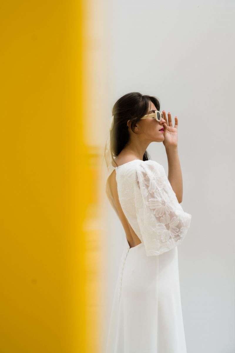 Robe de mariée à manches bouffantes mi-longues, col bateau et dos nu V inversé, made in France.