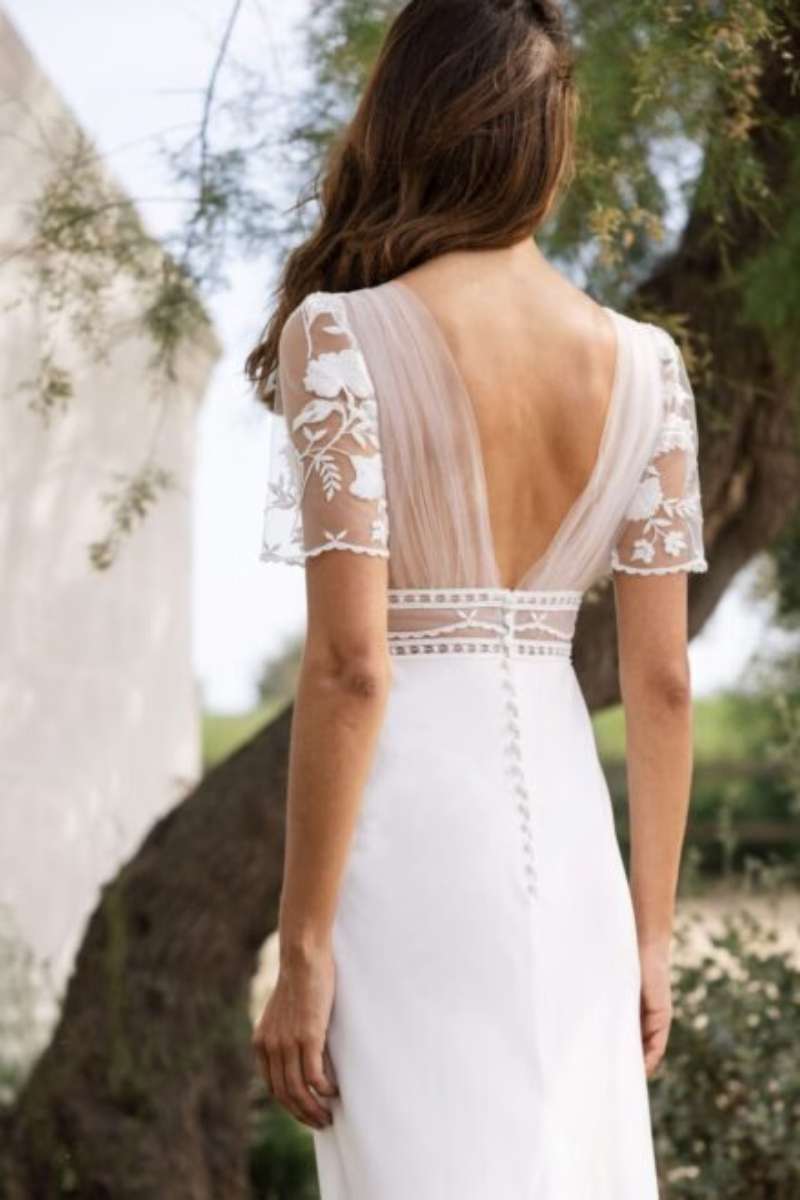 Manches courtes et ceinture en tulle brodé, dos nu en tulle plissé transparent.